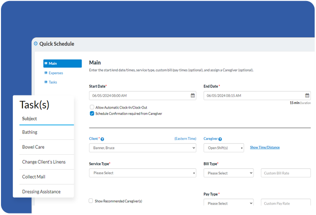 Our quick schedule feature is designed to help you maximize efficiency and save valuable time. With just a few simple steps, you can swiftly select a specific client and caregiver and enter the shift details and type of service. If you have standard shift timings, you can even configure those and click on the preferred time slot.