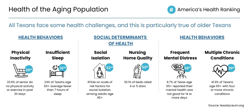 The Texas population is aging. In 2010, 10.3 percent of the population was 65 or older, but by 2050, that percentage is projected to increase to 17.6 percent.