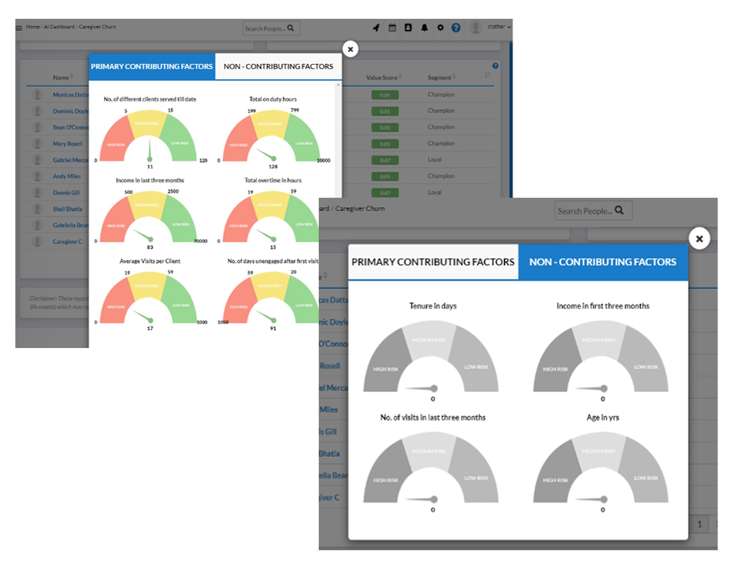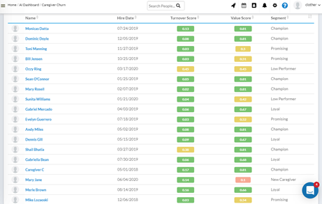 Select one of the boxes below to view the list of caregivers in that segment. Alternatively, you can select one value box and one turnover risk box to see a list of caregivers that match that combined criteria. Deselect a single criterion, by clicking on the associated box, to remove the filtering for that segment.