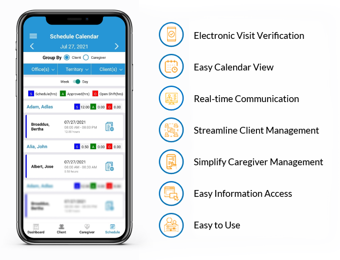 The feature-rich CareSmartz360 app enables homecare office staff to control operations, manage caregivers, monitor visits, improve communication, and enhance the quality of care all from one place.