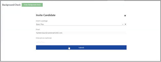 On the Background Check screen, the agency needs to click “Order Background Check”, then needs fill out the “Invite Candidate” form with the package details, email, and phone number. Once done, click “Submit”.