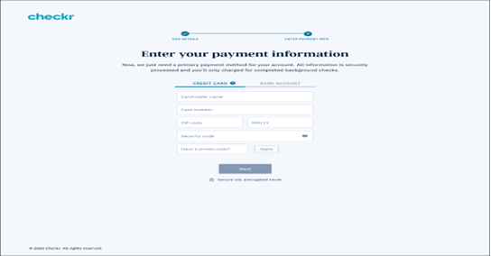 Next, the agency is required to input their payment details, i.e either credit card or bank information. Invoices for background checks will be issued directly by Checkr, not by CareSmartz360.