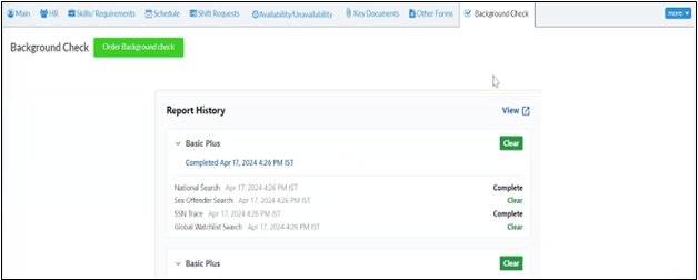 Once the background check is initiated, the status will be updated to “invitation sent”. From this screen, you can track the background check status for the caregiver. Also, on the Background Check screen, you can view the Background History, which provides details of all background checks conducted on the caregiver.
