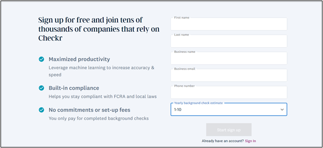 Upon clicking the button, the user will be directed to the Checkr sign-up/sign-in screen in a separate pop-up window.