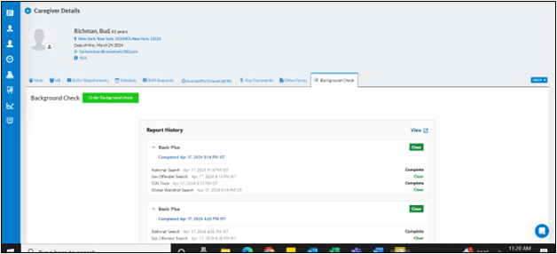 The tab leads to the “Background Check” screen for the caregiver.