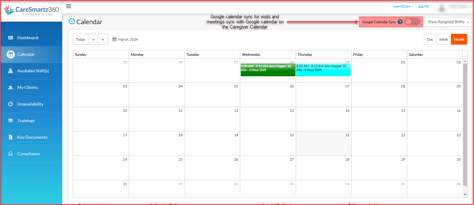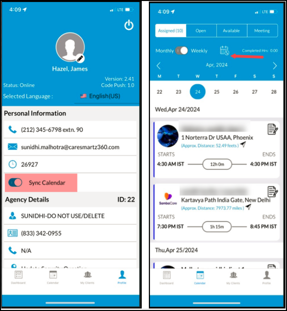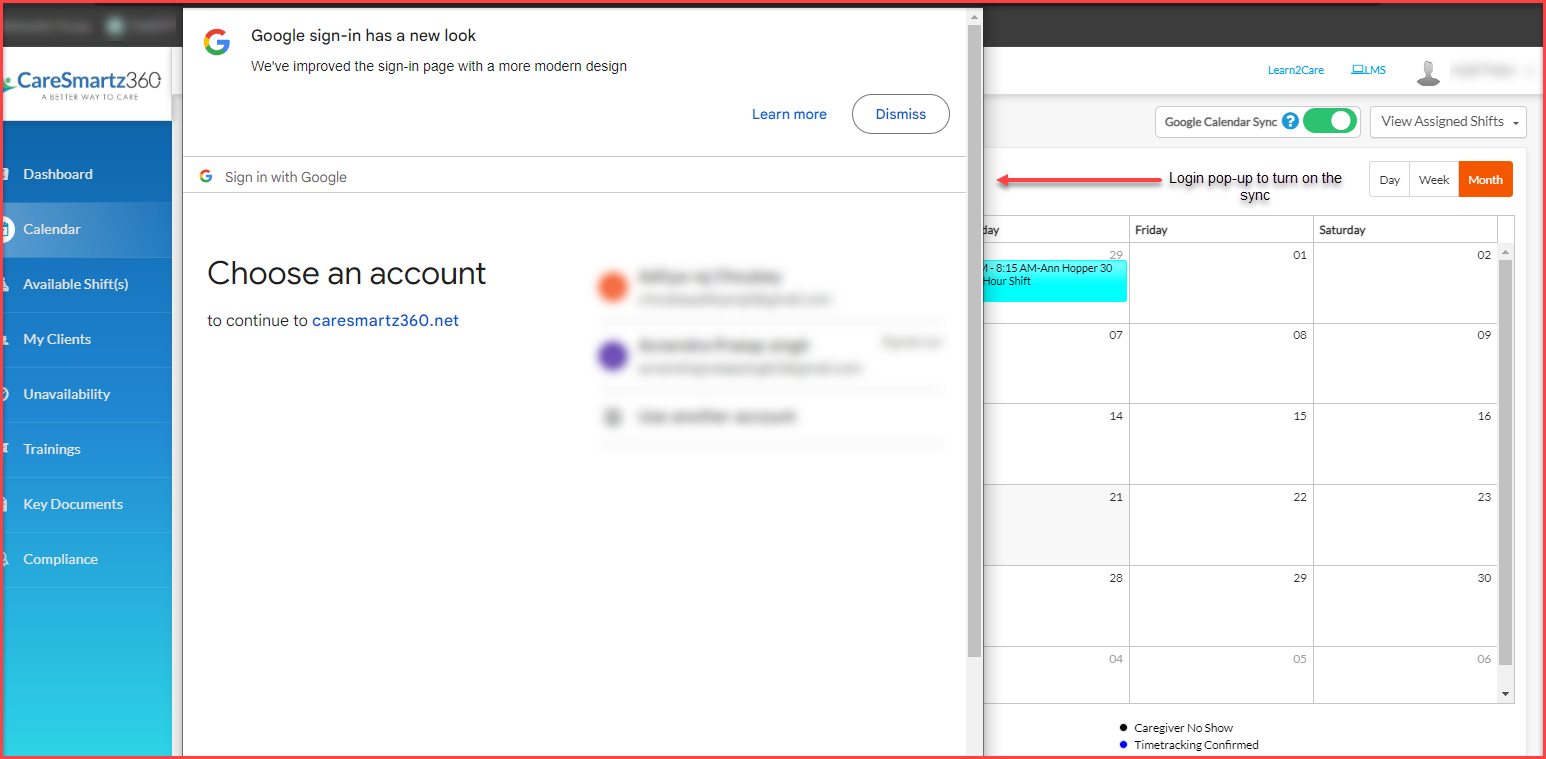 The Staff users can enable the feature from the Agency Portal by going into their profile and turning the toggle on. Simply log in, navigate to your calendar screen, and toggle the sync option to on. You’ll then be prompted to sign into your Google account to complete the setup.