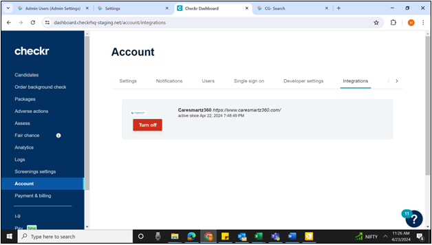 If the agency disables the instance in the Checkr Dashboard, the integration with CareSmartz360 will also be disconnected.