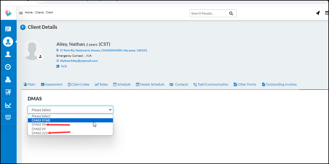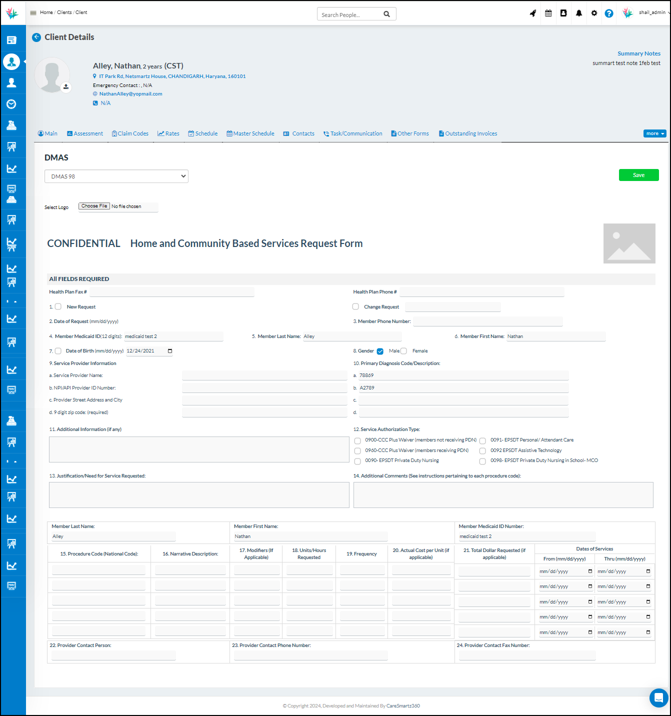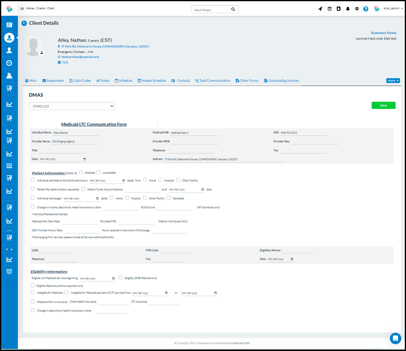 User(s) will have the ability to generate DMAS 225 form individually at each client level. A new tab has been introduced at the client profile in the name of DMAS where in the dropdown the user will be able to select the DMAS 225 form section. Upon selection, all the relevant sections will be populated for the users to enter the details & then hit Save.