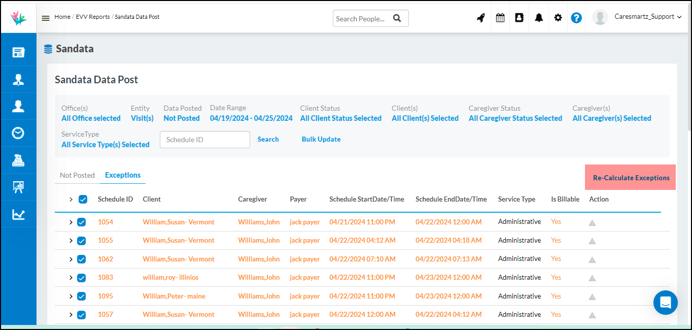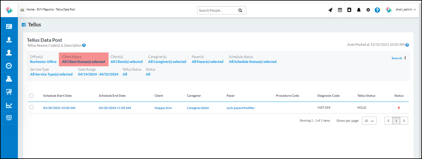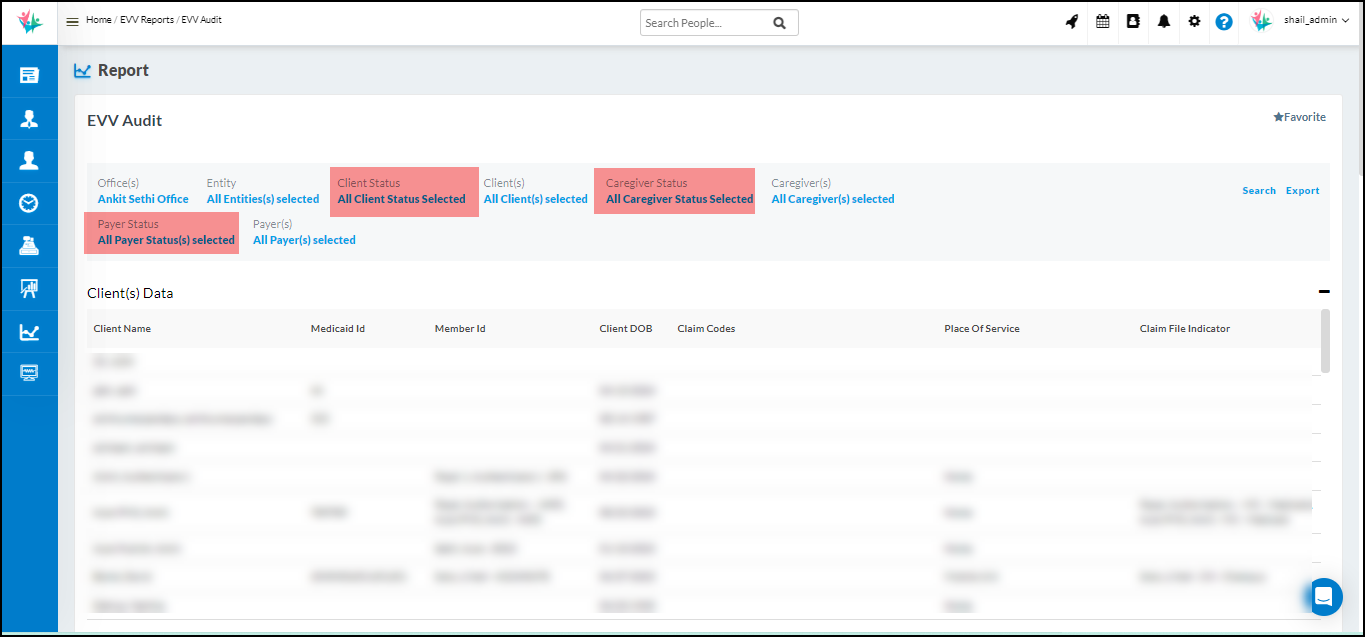 Following status filters have been added on the EVV Audit Report so that user can filter client/ caregiver/payer via status as well in case required.