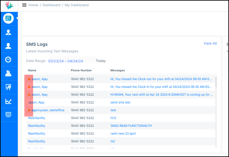 On the SMS Logs widget of the Dashboard, a yellow dot is visibly displayed next to ‘Name’ column if the that particular SMS is ‘Unread’ by the user. The ‘yellow dot’ is displayed for agency users to easily notice it beside ‘Unread’ messages in the SMS Logs widget. When a user clicks on a message, causing the Message pop-up to open, the system automatically updates the message status to ‘Read,’ and the yellow dot will immediately disappear for that specific message.
