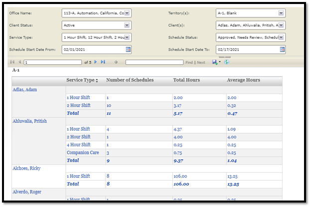1. Report name updated to “Client Total Schedules and Hours per month”.