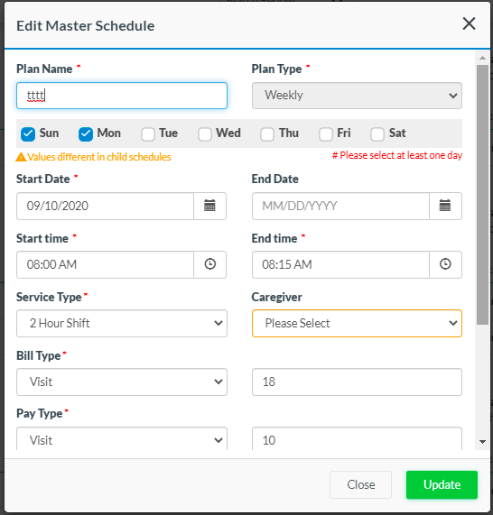3. Moving forward, while editing/creating a Master Schedule/Child Plan, you can select a “Service Type” and “Bill Type”. Based on the Date range, the system will automatically identify if there is a valid Auth linked with the selected “Bill Type” & “Service Type.” The system will then apply the authorization to the schedules being released from the Release Visit Plan automatically.