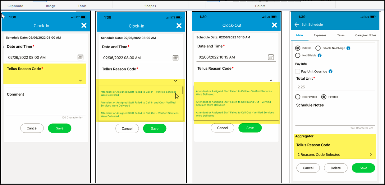 b. There is a total of 4 reason codes ( 1 on Manual clock -in / 1 on Manual clock- out & 2 on Visits edit ) that can be selected and sent to TELLUS.