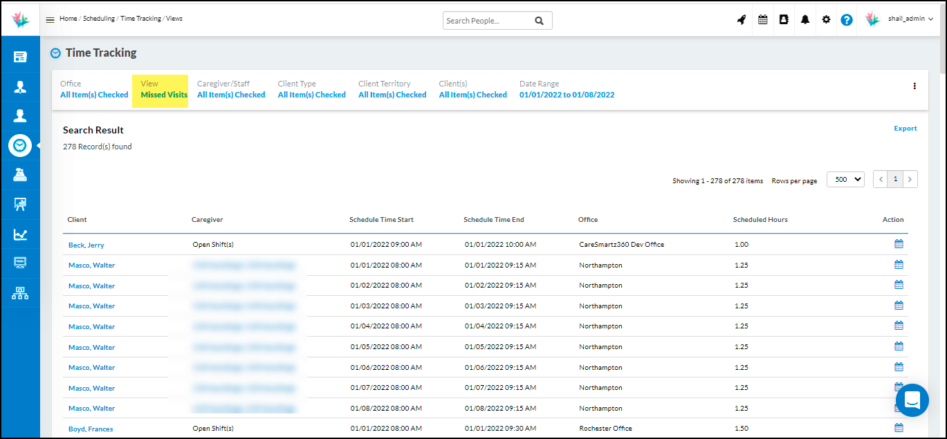 You can now view missed visits in the Time Tracking Views. With this feature, you can use the filters and take appropriate action on the missed visits.