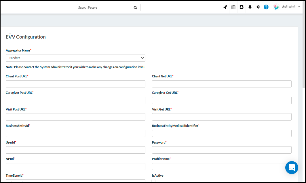 CareSmartz360 Support team members can help enter any required details configuring the setup on behalf of your team for Sandata on the EVV Configuration screen itself.
