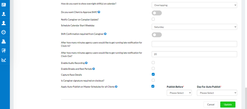 Once enabled the Agency user(s) need to select ‘Publish Before’ and ‘Publish On’ for Auto-Publish. ‘Publish Before’ allows to define the number of week(s) before an agency would like to publish and ‘Publish On’ allows to define the Day on which an agency would like to publish.