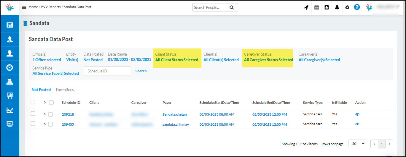 Client & Caregiver Status filters have been added in Sandata data post report for better usability.