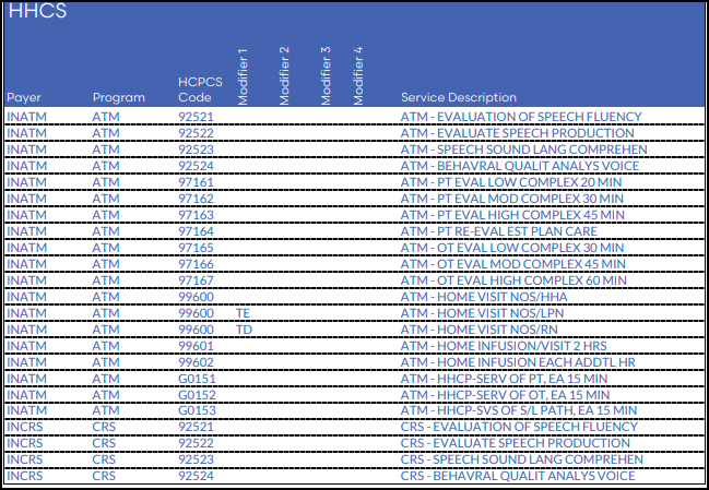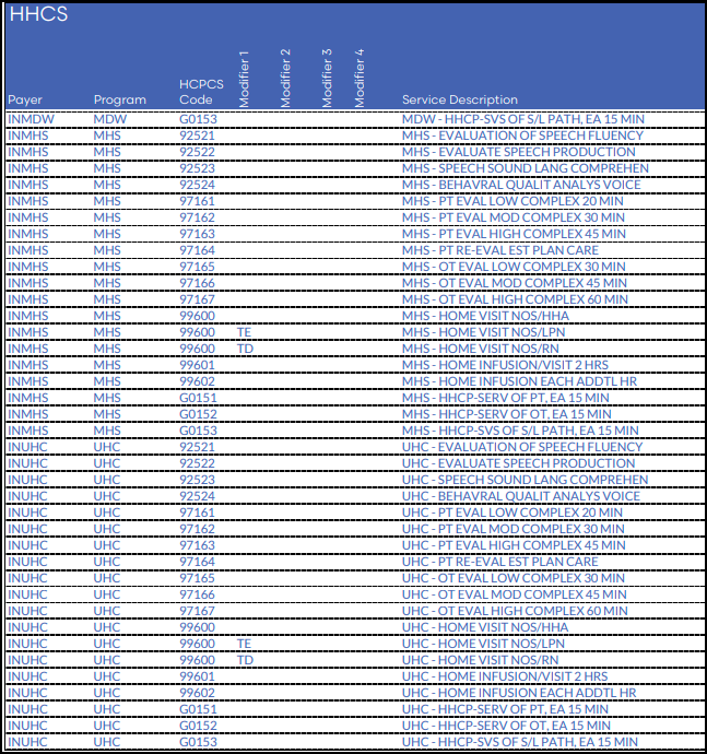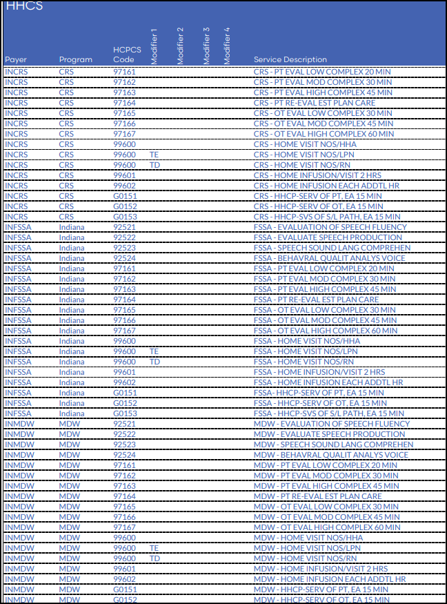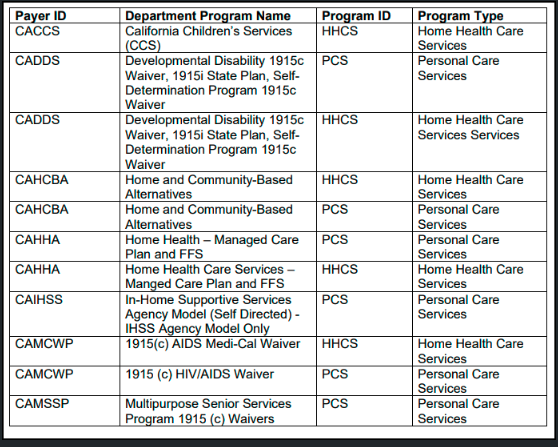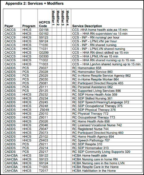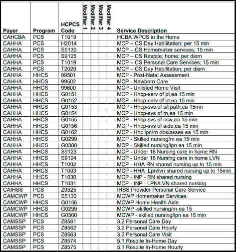 13. Updated Payer CAWPCS to CAHCBA for service T1019. Removed erroneous spaces before all descriptions and codes in Appendix table