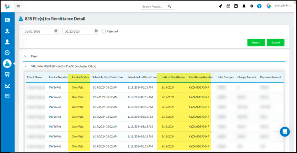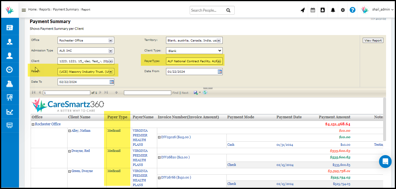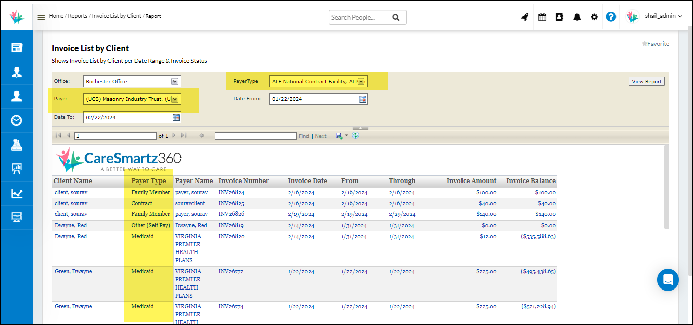 Into the accounting report “Invoice List by Client”, now you can filter and view the data with the additional filters “Payer Type” and “Payer”. The value for the “Payer” filter will populate based on the value(s) selected in the filter “Payer Type”. You can also identify which “Payer Type” and “Payer” are associated with each row record with the introduction of the Payer Type and Payer column.