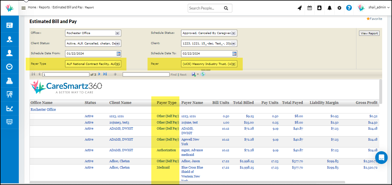 In the accounting report “Estimated Bill and Pay”, now you can filter and view the data with the additional filters “Payer Type” and “Payer”. The value for the “Payer” filter will populate based on the value(s) selected in the filter “Payer Type”. You can also identify which “Payer Type” and “Payer” are associated with each row record with the introduction of the Payer Type and Payer column.
