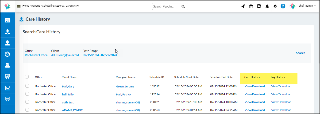 The Care History Report will be renamed as the Care History/Log Report and with the last two columns named as ‘Care History‘ and ‘Log History‘. Users can now easily access specific schedule details through options to view or download them.