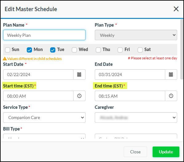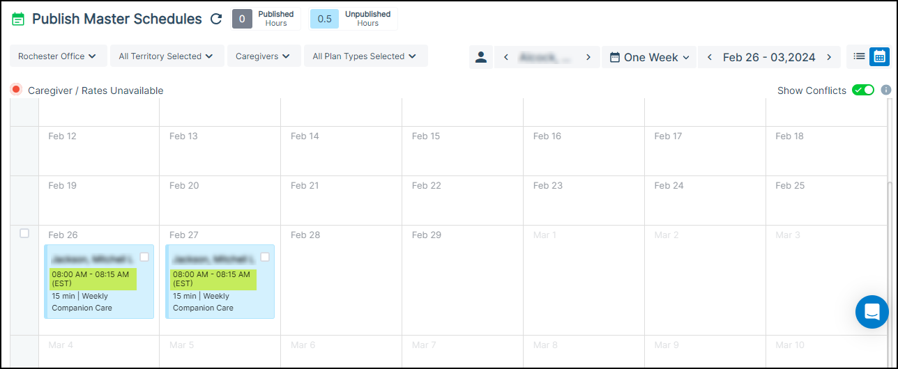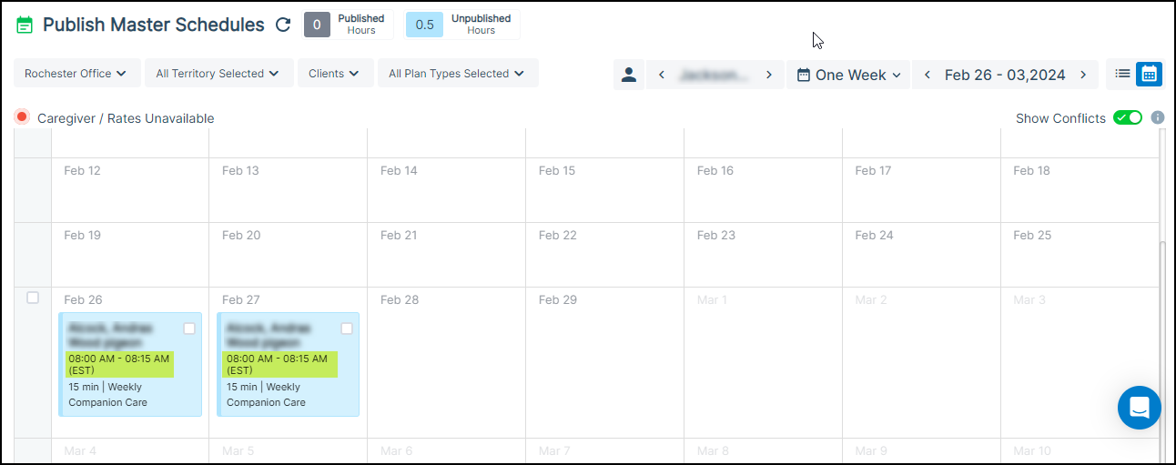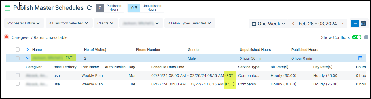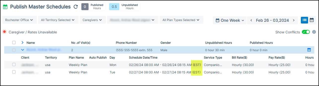 Furthermore, utilizing the ‘Group by Caregiver’ option enables Agency users to view scheduled dates and times in each client’s time zone on both list and Calendar views. Schedule conflicts will also be depicted according to the client’s time zone, mirroring the conflicts on the schedule window.
