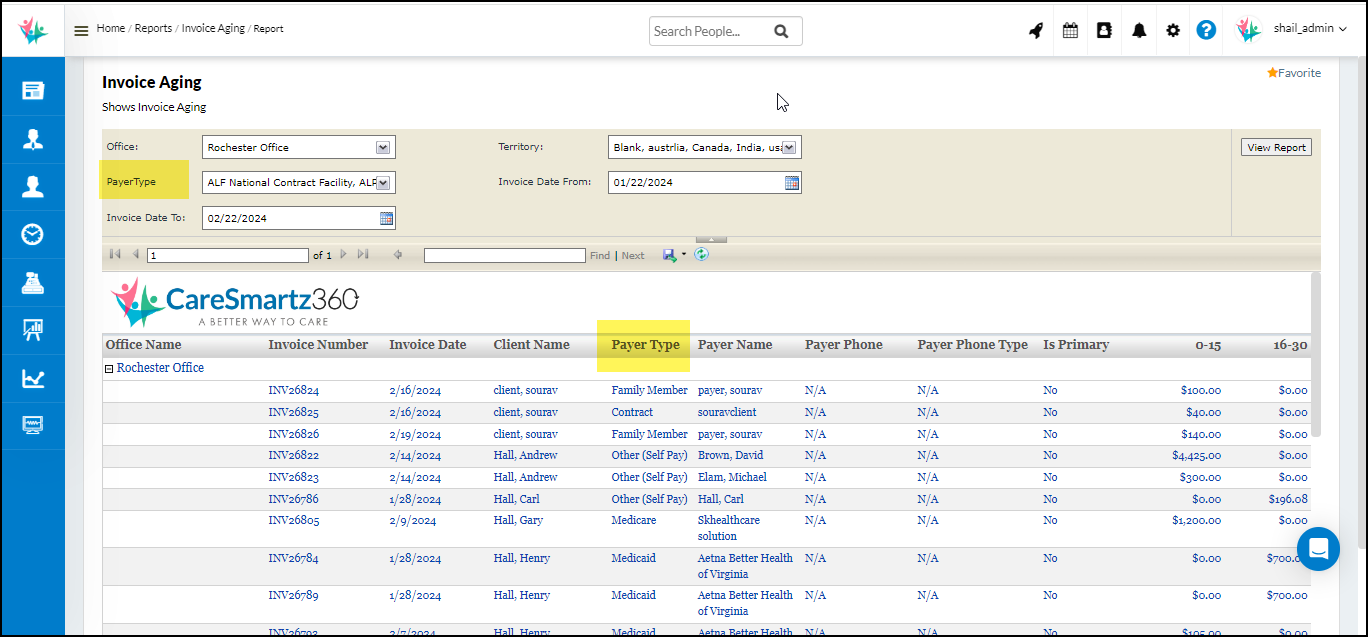 With the introduction of the “Payer Type” filter in the accounting report “Invoice Aging”, you can now view and filter the report by selecting the desired “Payer Type” in the report. By default, the filter will contain no value. You can select the filter values as “Select All”, and “Multi-select” as per the values available in the report.