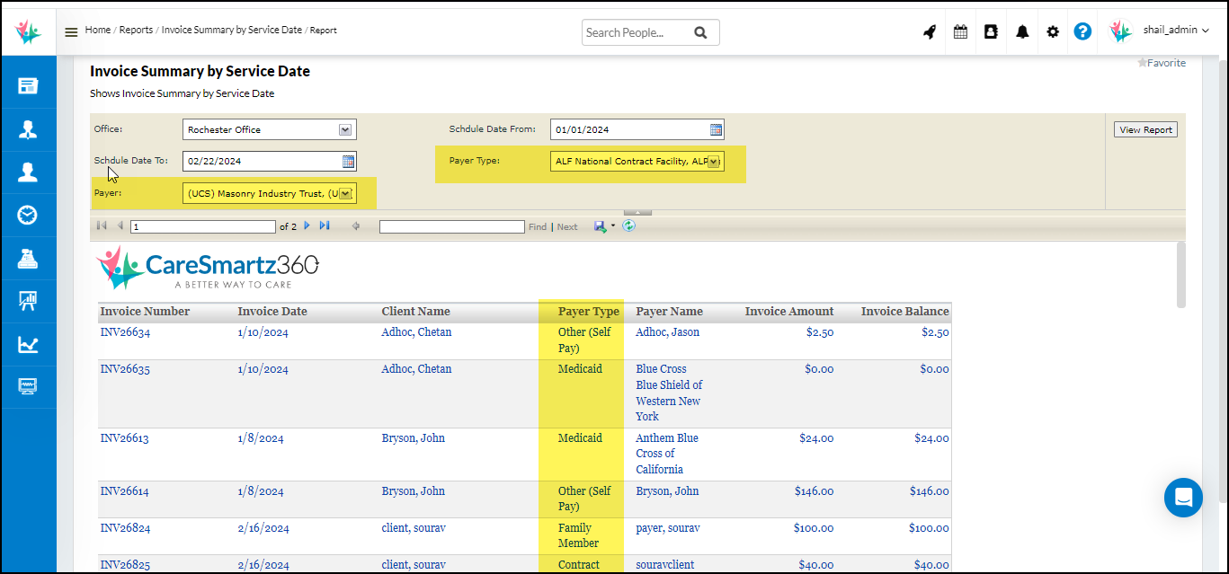 In the accounting report “Invoice Summary by Service Date”, now you can filter and view the data with the additional filters “Payer Type” and “Payer”. The value for the “Payer” filter will populate based on the value(s) selected in the filter “Payer Type”. You can also identify which “Payer Type” and “Payer” are associated with each row record with the introduction of the Payer Type and Payer column.
