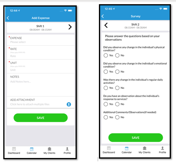 7. Auto clock-in/clock-out will happen at the scheduled time. In case the caregiver does not fill in the details within the threshold, they will have an option to enter the details at the end of the last shift where the caregiver will see a screen to enter details on a per shift basis. This will be done within the threshold of the last shift for these subsequent shifts only.