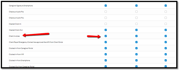 Under Office Settings → Client Portal Permission, there is a new Care History attribute labeled “Client Invoices.” Users will now have the ability to select the type of user (Client User, Emergency Contact User or Payer User) whom they would like to show or hide the client invoice section. By default, all the 3 columns will be selected & client invoices will be shown for Client/Payer/Emergency Contact users.