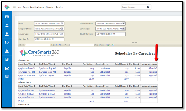 Under Reports -> Scheduling -> Schedule by Caregiver report, We have added a new column for Schedule Status.
