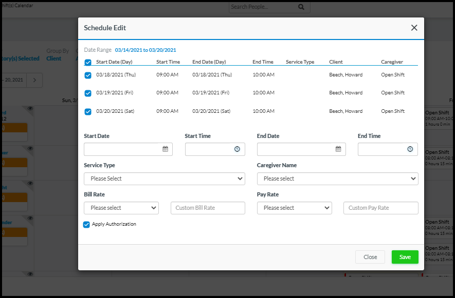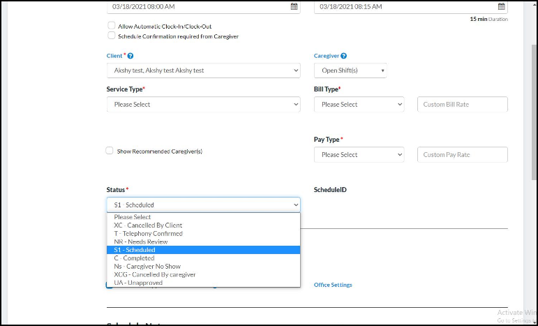 User(s) will have the ability to select the default service type that would then be carried forward at the time of creating the schedule for that particular client. The value for service type would appear as selected under the service type drop-down on the create schedule window.