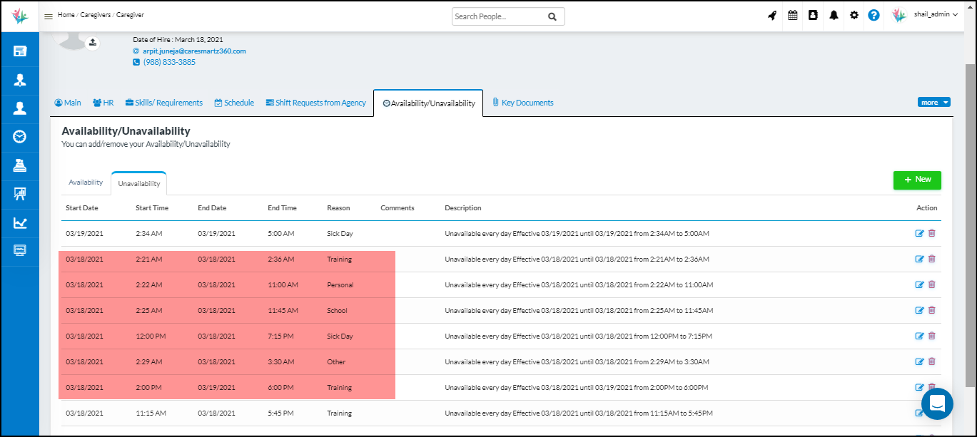 Now the system will allow overlapping of unavailability at the time of creation. Earlier it was not allowed. This can be done from the Agency portal and Caregiver Portal and Mobile app.