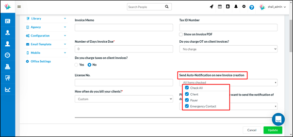 The system will now allow user(s) to send notifications on new invoice creation to multiple recipients based on the selection done under office settings -> Billing tab -> Send Auto-Notification on new Invoice creation.