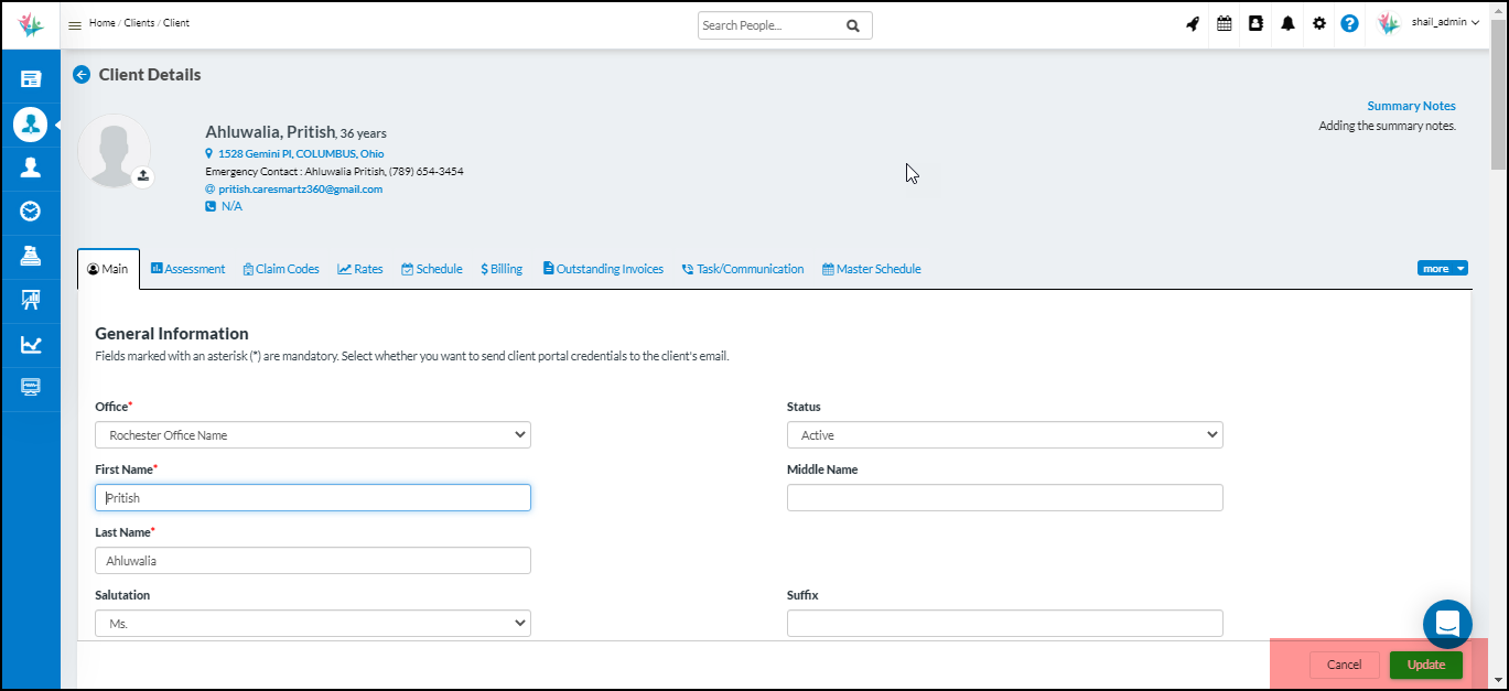 The Update / Cancel buttons will remain visible (reducing scrolling) for several areas in CareSmartz360 – On the Main tab of all the profiles (Client, Caregiver, Staff, etc.) and Admin settings (Including Office Settings).