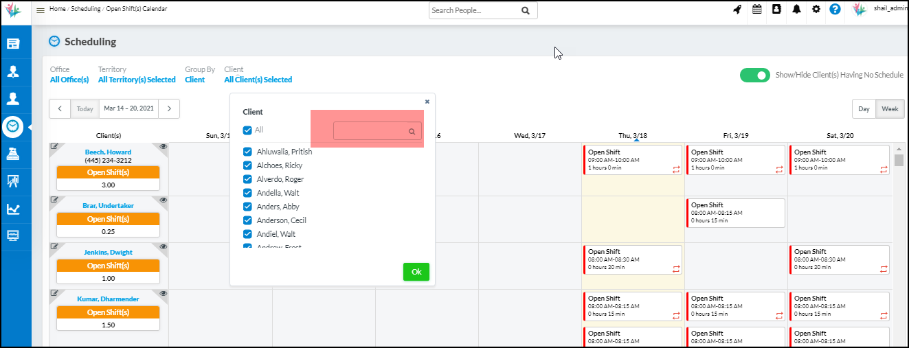 An option has been added to type in the name of the client in the Client Search filter available in the Open Shift(s) Calendar.