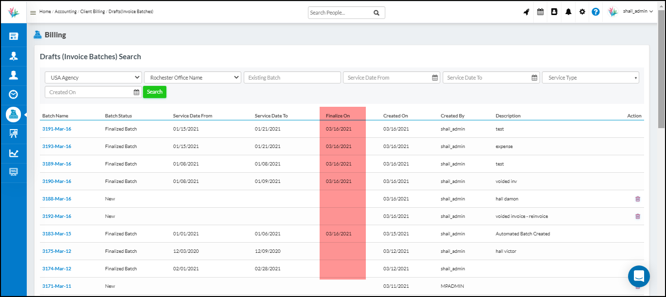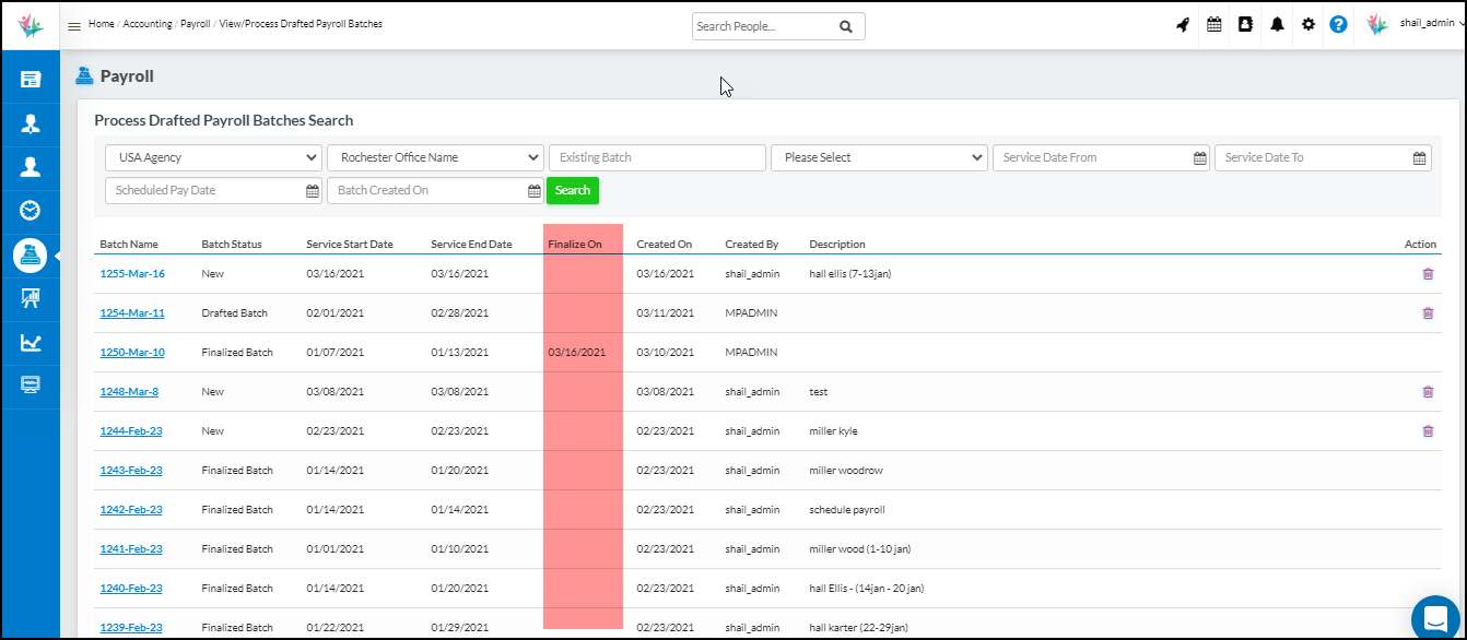 User(s) will now be able to see one more column on the View/Drafted Invoice screen, labeled as ” Finalized On” and also on the View/Drafted Payroll screen so that they can review when the invoice or payroll batch was finalized.