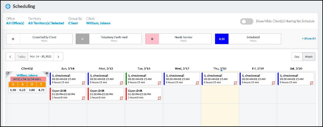 User(s) will have the ability to send SMS to Client/Caregiver right from the schedule calendar itself where the phone number of the specific profile is mentioned.