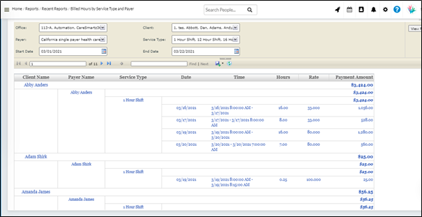 3. Reports -> Accounting -> Billed Hours by Service Type and Payer: A new report is being introduced in the system in the name of ” Billed Hours by Service Type and Payer”.