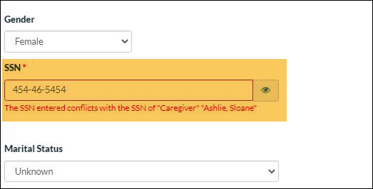 The SSN entered conflicts with the SSN of “$Entity Type$” “$LastName, First Name$”.
