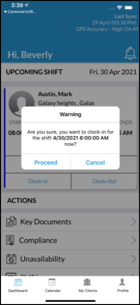 On the Mobile app, caregiver(s) will be alerted if they try to clock-in/clock-out on wrong day. The app will prompt the user and check if they still want to proceed further.