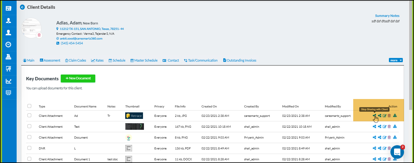 Agency User(s) can now Share and Stop Sharing multiple documents with Client(s) and Caregiver(s) at once. This can be done from the Client profile > Key Documents section and Caregiver profile > Key Documents section.
