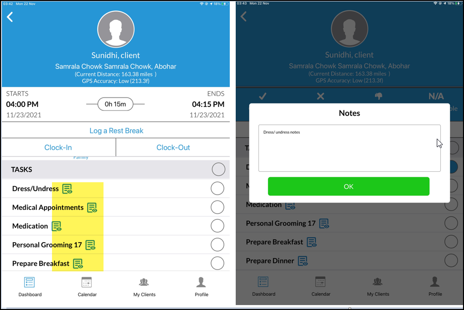 Caregivers can view the Task Notes on the Schedule Detail screen for each task that is available.