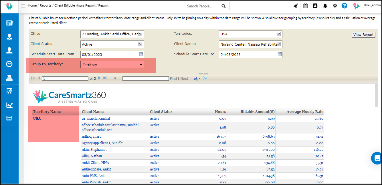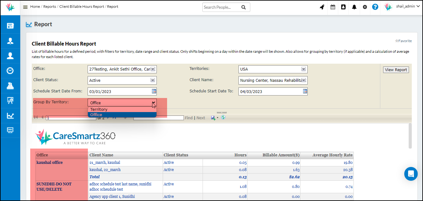 The Caregiver Payable hours and Client Billable hours report has also the ability to group by office. We have renamed Group by Territory filter to Group by with options as Office & Territory. Grouping in these reports will be provided by Office or Territory. Office filter is also included in the reports.