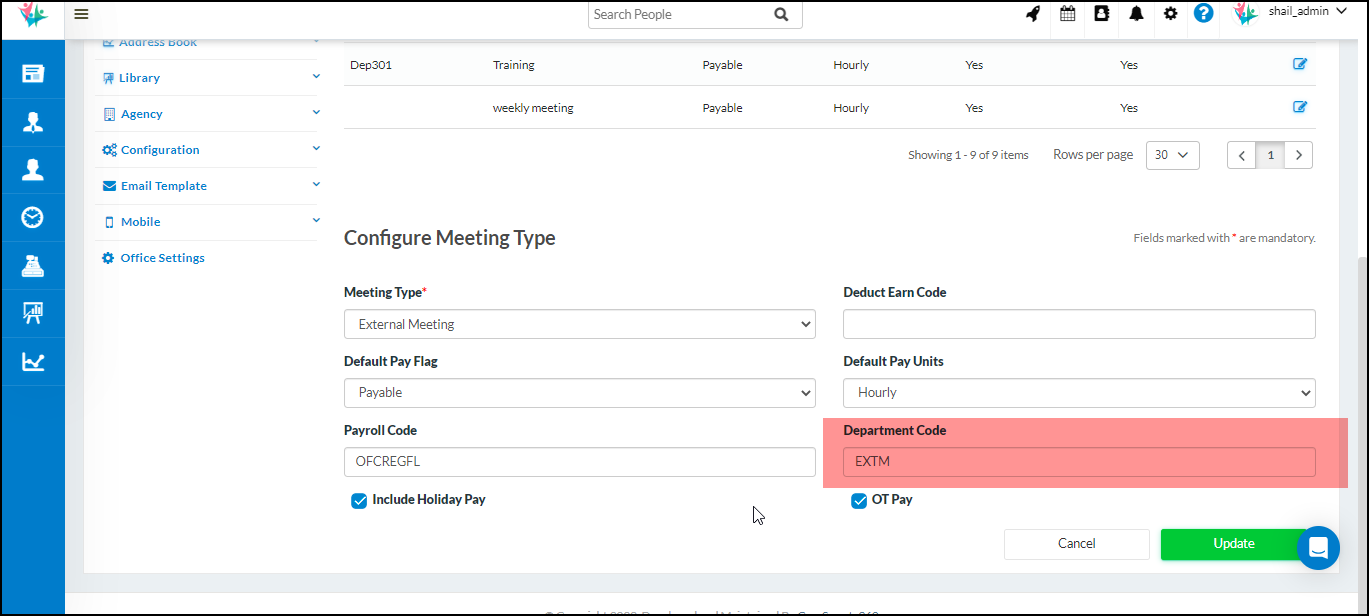 The ‘Department Codes’ of the Meeting Type which is configured in the Admin settings → Scheduling → Meeting Type will now be populated in the column of ‘Temp Dept’ column in the ADP export file.