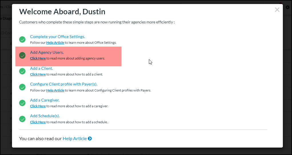 In the Welcome Aboard popup, “Add agency User” option will be an optional field from now on. In case if there are no Agency users in the system, providers can skip this step & it will not prompt the users to add & complete the set up.